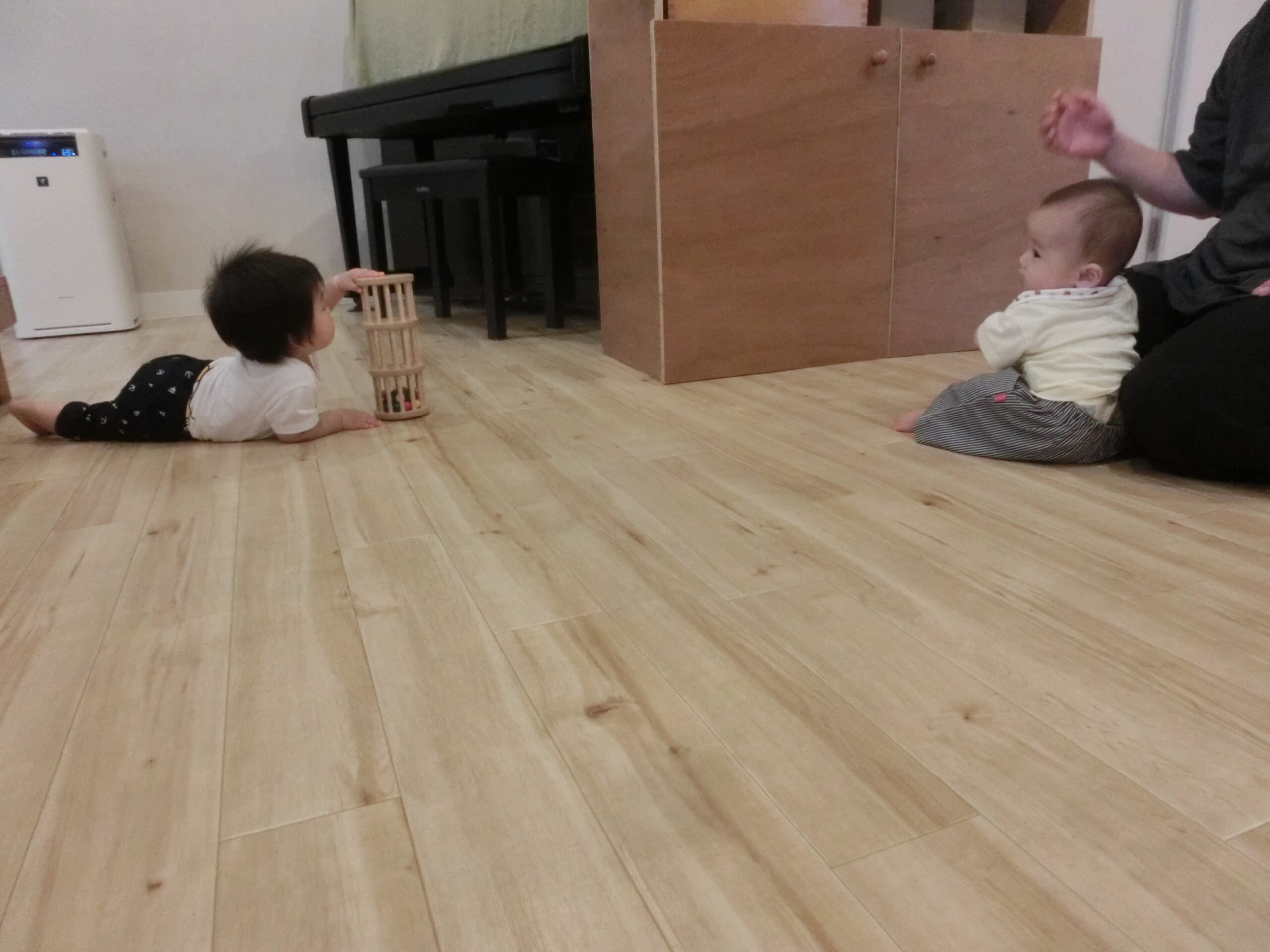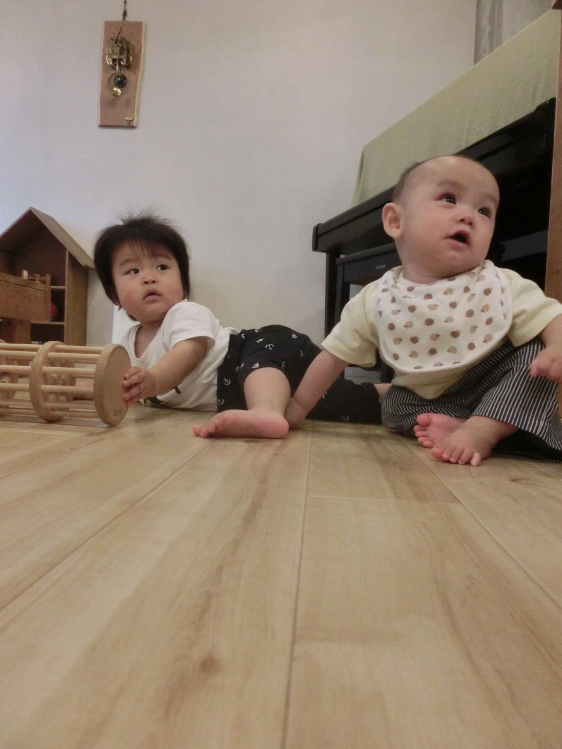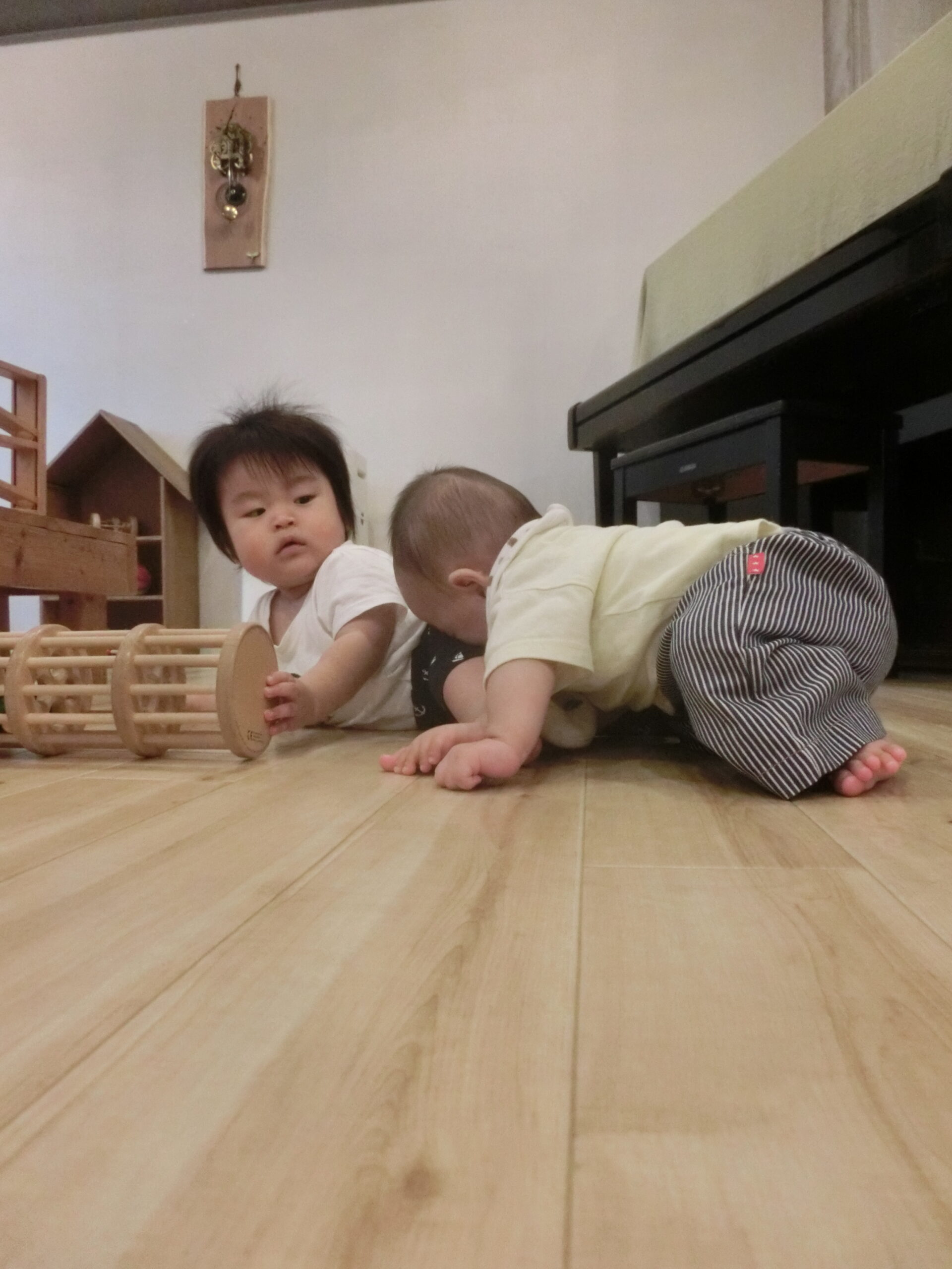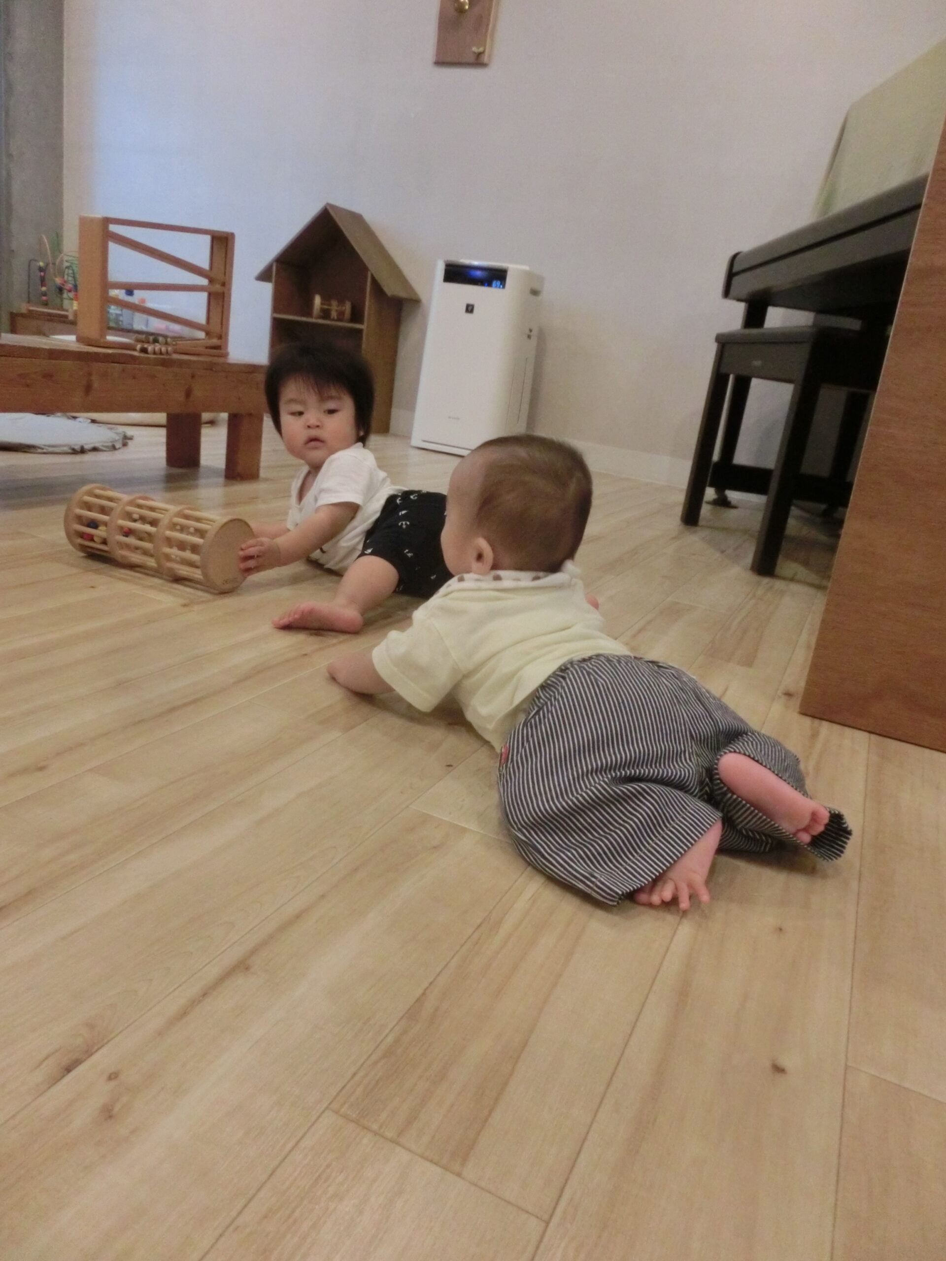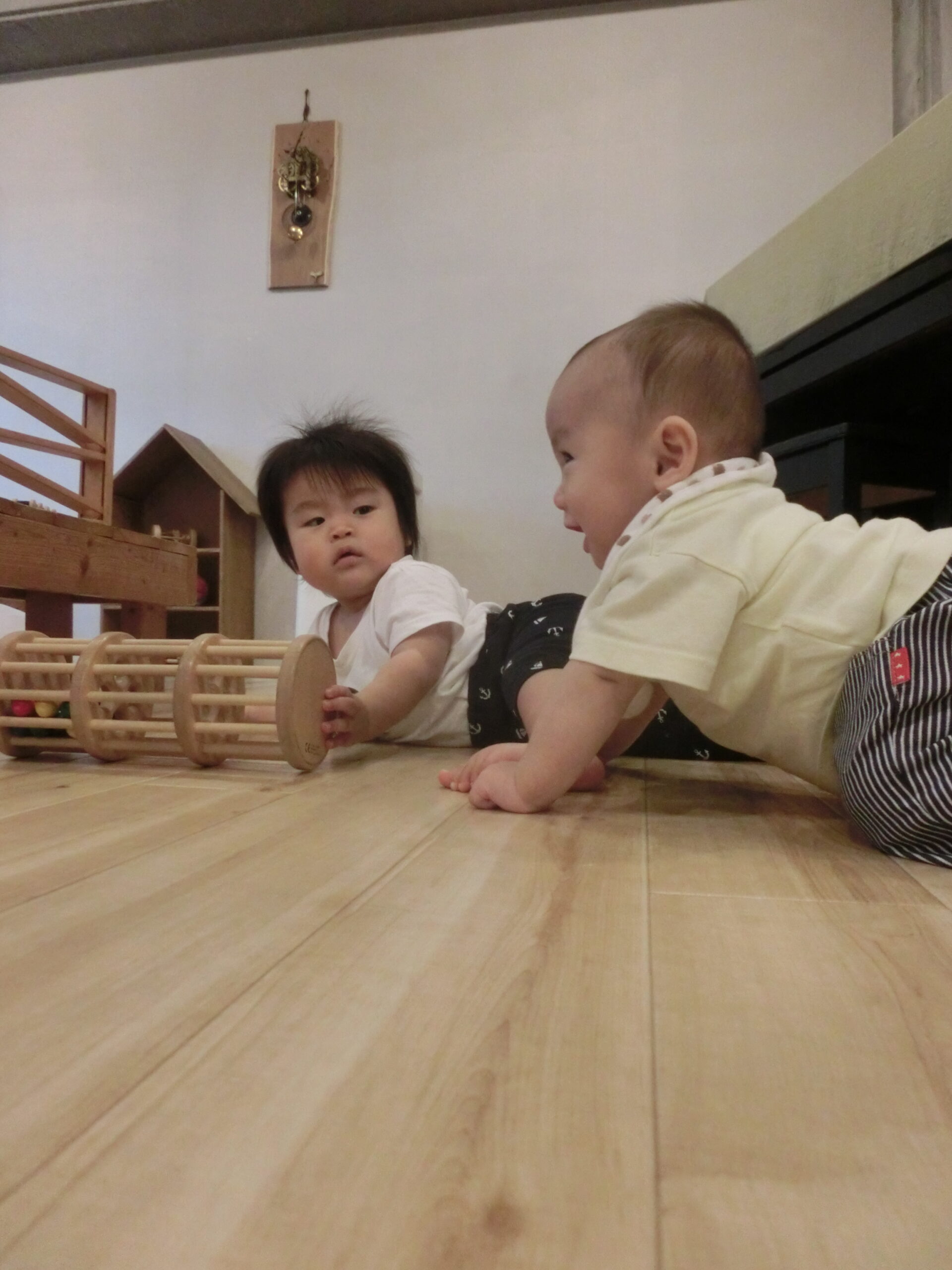 この日遊びに来た0歳児のH君とT君。雨が朝から降っており、涼しく過ごしやすい日でした。朝は眠たそうにしていたT君。「お天気も悪いし、大人もなんだか眠たいですよね」なんて話していたのですが、H君が遊びにやってくると何やら気になる様子で目で追い始めたT君。抱っこから降りるとH君の元へずりばいで進んで行きました。