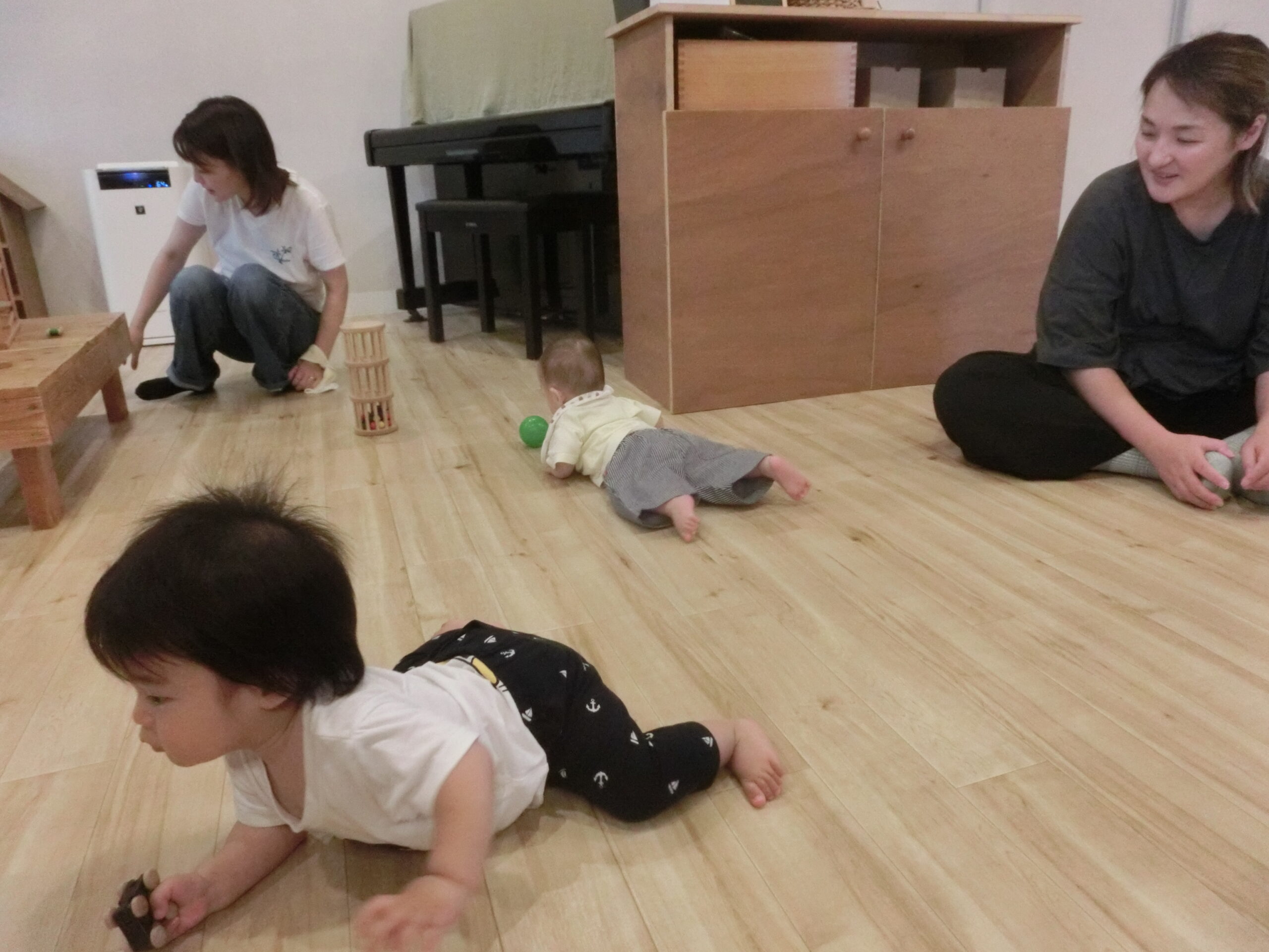 その後も、ずりばいをしながら「うー!」「うーうー!」と声を出すT君に共鳴するようにH君も「あー!」「あーあー!!」と声を出して応えていました。今まではそれぞれがそれぞれの世界で遊んでいた2人ですが、この日はお互いが気になり同じ遊びをしたり、室内をずりばいで進み声を出して遊んだり、様々な姿を見せてくれた2人でした。お母さん同士も、「こんなに動くのは珍しいです!」「家での姿が少し出せたね」等と、こども達の変化に驚きつつも、嬉しそうに話す姿がありました。その後は、外の雨の音を聞き、遊びをやめてじっと窓の外を見つめたり、雨音を聞きながら、さかさかさの本を読んだり、ゆったり過ごした2人でした。「そんな過ごし方も雨ならではで良いですね」なんて話してくれたNさん。日々成長していくこども達の姿をみんなで発見し、喜び合う日々がとても愛おしく感じた1日となりました。M.O