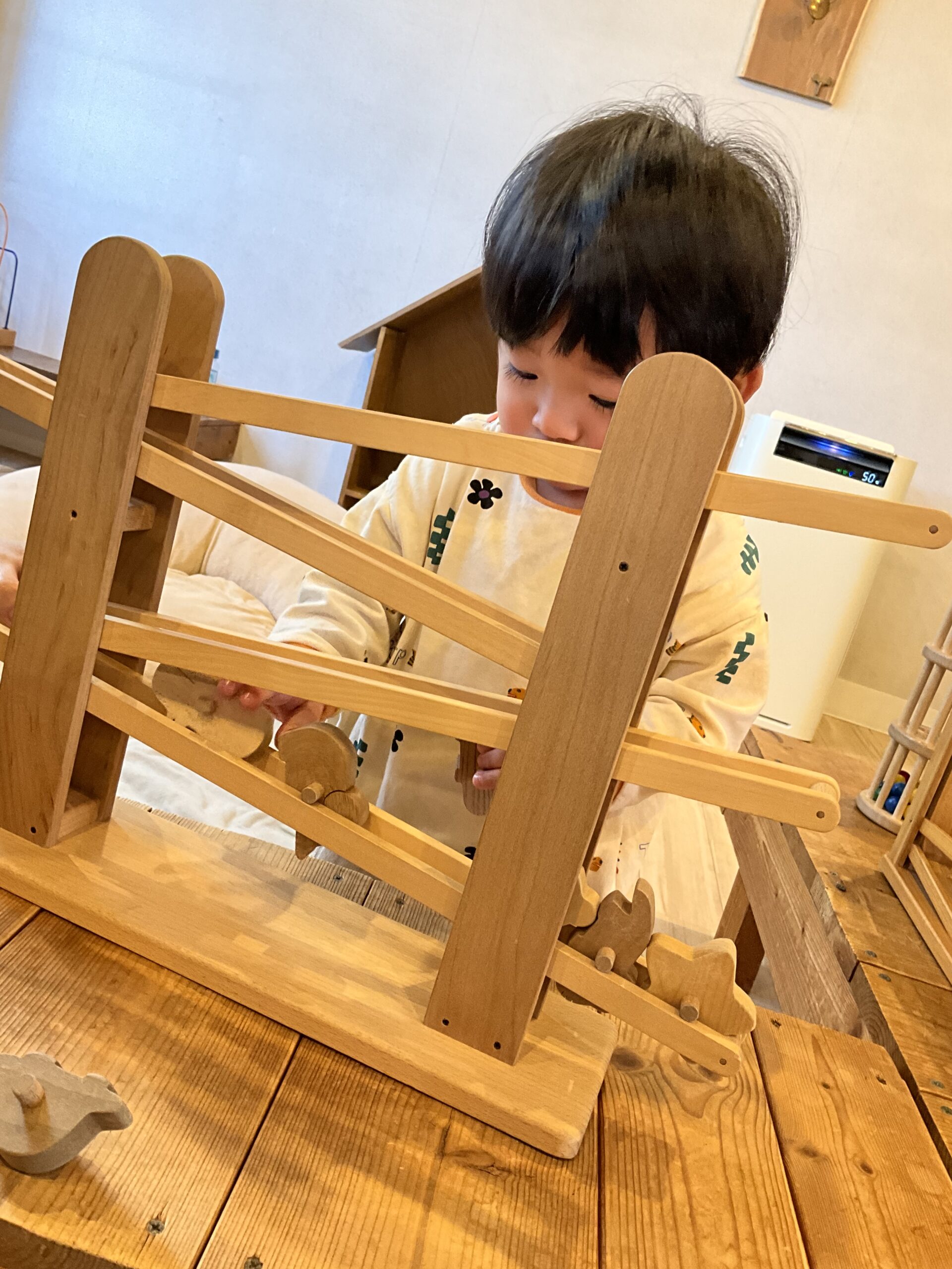 ある日のわたぼうし。この日は0歳児のA君の貸し切りとなる時間がありました。ハイハイの頃から遊びに来てくれているA君は、最近歩けるようになり、広い室内をゆったりと使いながら遊びを進めていきました。今日はその様子をご紹介します!手を洗い終えると向かったのは、コロコロと転がる木の玩具。A君は何度も自分でレールに色々な形の小さな木の玩具を乗せようと挑戦します。細いレールに乗せるのは少し難しいのですが、「やり方は覚えているんだよね」と声を掛けるお母さんと一緒に、亀やうさぎ、星の形をそっとレールに置き、コロコロと転がる様子をじっと見つめていました。