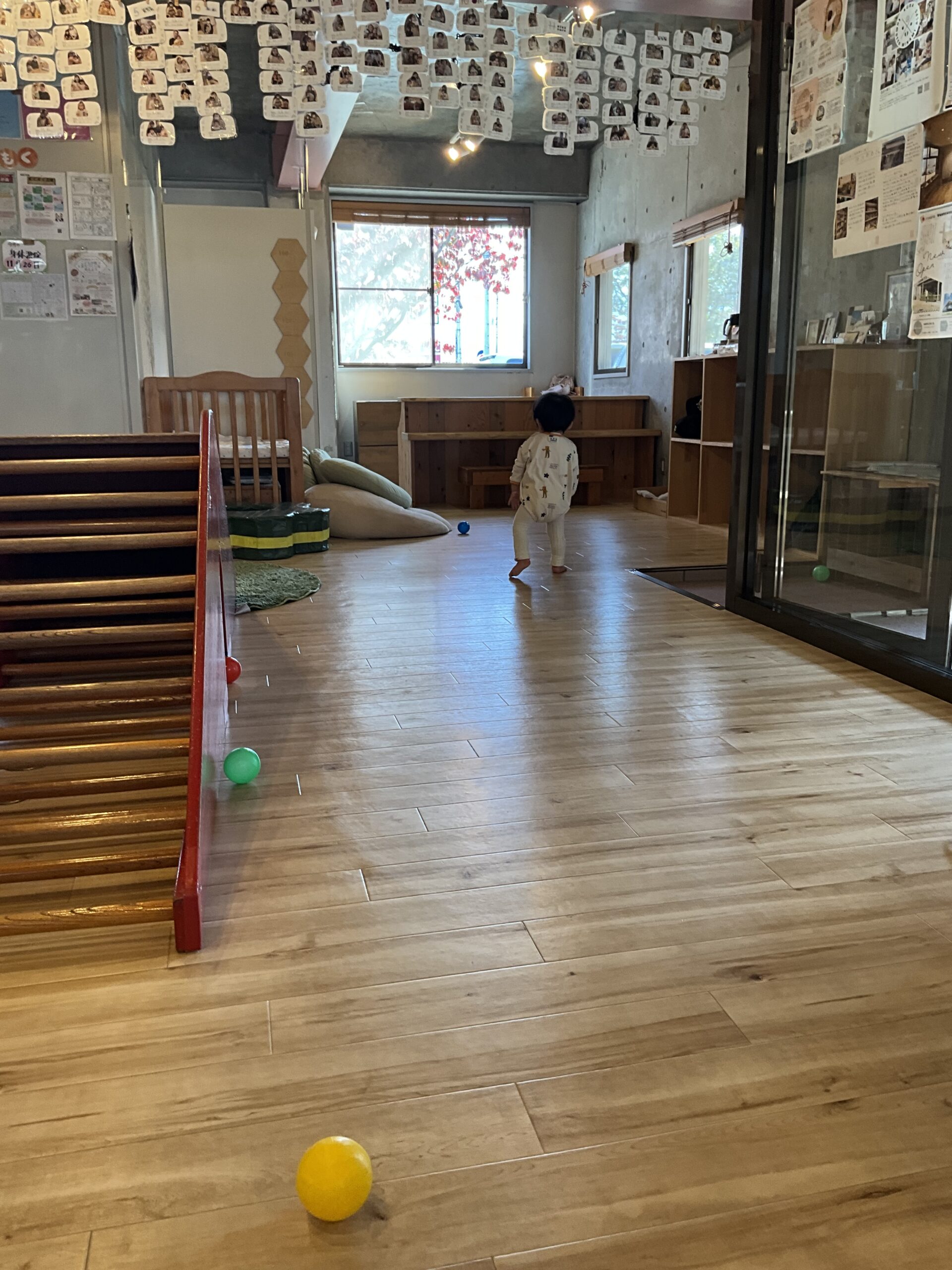 消防車を押しながら進んだ先で目に入ったのはボールのようで、次はそちらに向かいました。ボールの入っている籠を両手で上下に動かして、中のボールが跳ねたり落ちたりするのを楽しんだかと思うと、今度は滑り台へ!慣れた様子で登っては滑り、を繰り返します。滑り台を終えると次はキッチンコーナー!次々に自分で遊びたい場所へ向かうA君を、お母さんも「次はそっち!楽しいね~!色々遊びたいね!」と追いかけながら見守ります。