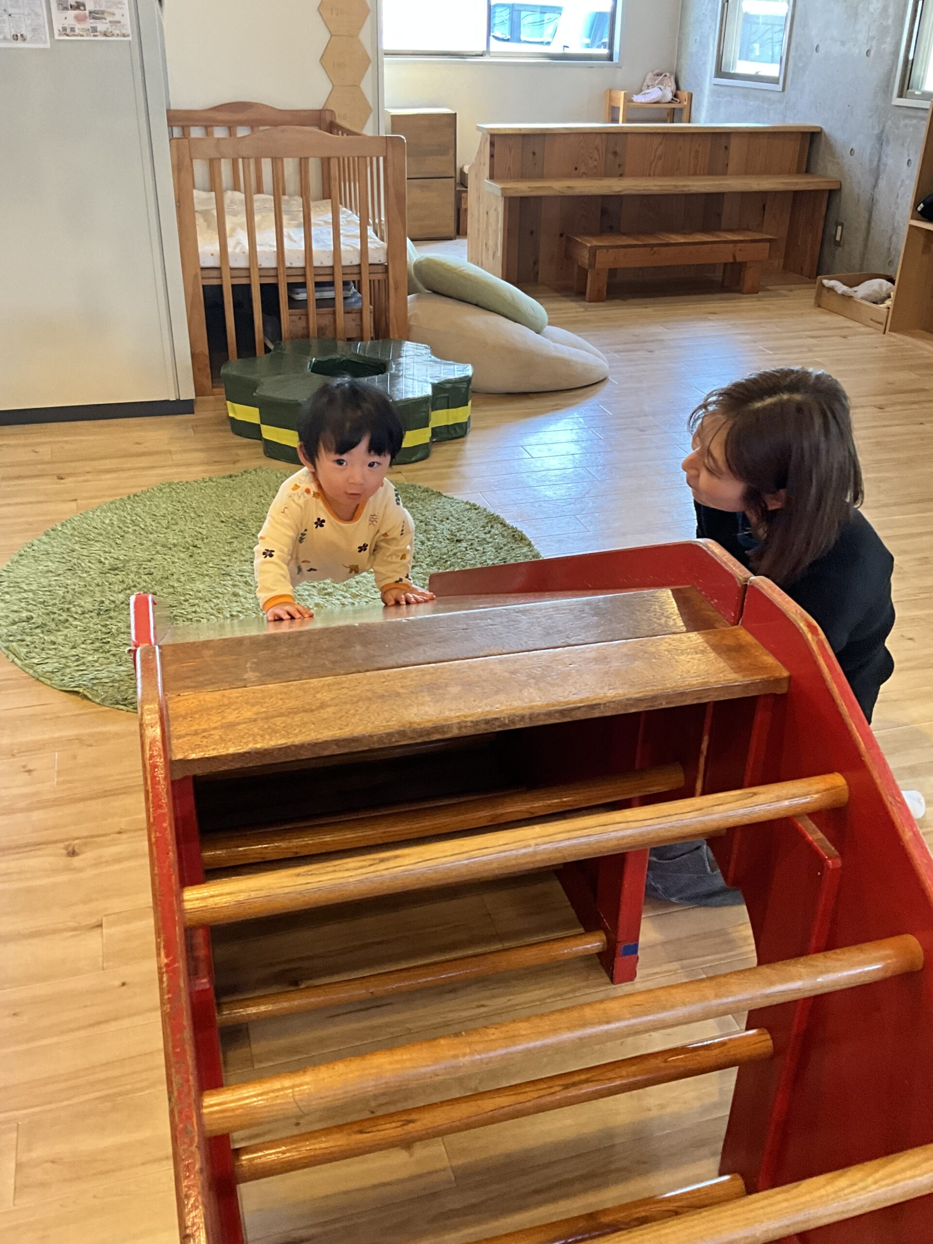 わたぼうしに来たばかりの頃は少し緊張した様子で、お母さんの側でハイハイをしていたA君。そのA君が今は好きな場所へ歩いて向かい、夢中になって遊ぶ姿に成長を感じ、それをお母さんと共有出来る事をとても嬉しく感じました。しばらくすると、同じく0歳児のK君がやってきました。A君はじっとK君の顔をじっと見つめ、K君もまたA君の顔を見つめ返します。言葉は無くても、目を合わせたり近くで同じ時間を過ごす姿に、0歳児ならではのやりとりがあるんだな、と面白さを感じました。少しの間一緒に遊んだ後も、まだ遊びたい気持ちがいっぱいのA君。それでもお母さんに抱っこされると安心した表情になり、帰り際には職員に手を振ってわたぼうしを後にしました。この日はA君が広い室内で好きな遊びを存分に楽しんでいる姿をお母さんと一緒に見る事が出来ました!一つひとつの「出来た!」や「楽しい!」をお母さんと一緒に共有出来た事が、とても嬉しかったです。その成長の瞬間を、これからも一緒に見守らせてください!Y.F