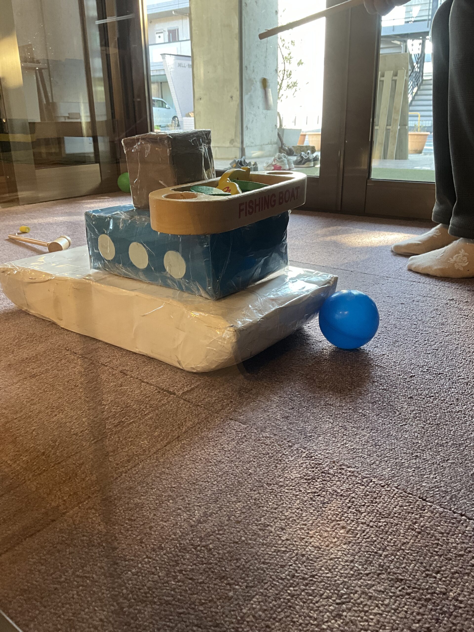 お母さんも誘い、釣りに行くのですが、お母さんの乗る船がない為お母さんはいつも泳いで岩に見立てた木に座り釣りをします。2人でたくさんの魚を釣り、「大漁!」と言いながらキッチンに戻ってきます。そんなRちゃんに「これは何の魚?」と聞くと、必ず「さば!」と答えてくれるRちゃんです。どうやらさばが好きな様子で、給食でもさばが出た日には、「今日は魚だったよ」と、嬉しそうに教えてくれます。フライパンでさばを焼き、お皿に盛り付け、漁の後の腹ごしらえの時間です。お母さんには食後のコーヒーも淹れてあげており、一緒に漁に出た母をねぎらうRちゃんです。Rちゃんの想像力や発想で展開される遊びが楽しい時間になります。お母さんも、Rちゃんの遊びを「そういう事か!おもしろいね!」と、一緒に楽しんで過ごしており、職員も時には一緒に釣りに誘ってくれます。海を想像しながら釣りをし、泳いだりして過ごす時間はとても楽しく和やかな時間となります。今度はどんな遊びが始まるのか楽しみにしつつ、Rちゃんが興味のある魚にまつわる遊びを展開できたら良いなと思い、どんな事をしようか考えていこうと思います。M.O